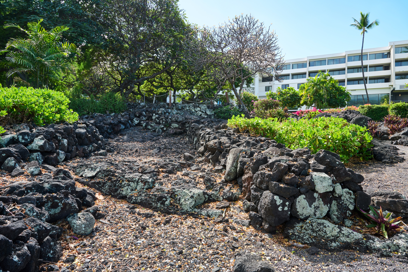C'est ici que le canoë était stocké lorsqu'il n'était pas utilisé ou peut-être aussi là qu'il était construit. Il y avait un toit au-dessus et le sol pouvait être recouvert de galets ou de sable usés par l'eau. L'entrée et la sortie de l'océan se trouvaient juste devant, dans l'alignement de l'ouverture du hangar à canoës. Les récits des habitants qui ont grandi à Keauhou et pêchaient dans cette région évoquent un chemin rocheux qui menait à l'océan. Il s'agissait très probablement du débarcadère des canoës. Juste derrière le halau se trouvent deux fondations de maison. L'une est directement alignée avec l'arrière du hangar, l'autre à droite.